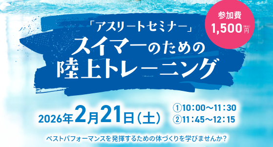 スイマーのための陸上トレーニング 事務局2026年2月5日 参加者募集中! 東京都水泳協会医科学委員会所属のトレーナーがスイマーのための陸上トレーニングを指導します。 主催 東京アクアティクスセンター 期日 2月21日(土) 【申し込み・問い合わせ】 東京アクアティクスセンター TEL:03-5534-6410 ➡セミナー詳細